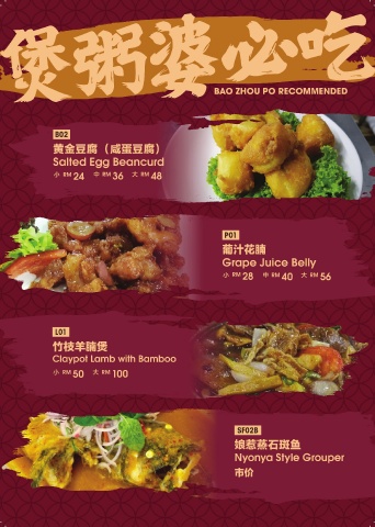 煲粥婆必吃 BAO ZHOU PO RECOMMENDED B02 黄金豆腐 (咸蛋豆腐) Salted Egg Beancurd 小 RM 24 中 RM 36 大 RM 48 P01 葡汁花腩 Grape Juice Belly 小 RM 28 中 RM 40 大 RM 56 L01 竹枝羊腩煲 Claypot Lamb with Bamboo 小 RM 50 大 RM 100 SF02B 娘惹蒸石斑鱼 Nyonya Style Grouper 市价